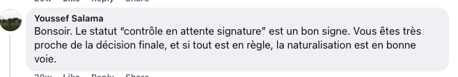 ) confirme qu’après avoir fourni les compléments et qu’on passe à Contrôle en attente retour hiérarchique puis Contrôle à effectuer et ensuite à Contrôle en attente signature que c’est très positif. Croisons les doigts et gardons le contact.