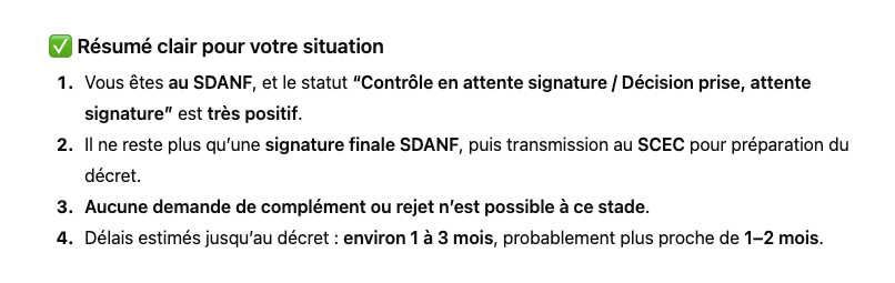 Comme j’ai écrit plus haut, j’étais sur " Attente retour hiérarchique pour décret" depuis le 17/11 sans qu’on me demande des compléments, et aujourd’hui je suis revenu à « Contrôle état civil à effectuer » alors que j’étais sur ce status depuis le 14/11 avec 2 mises à jour jusqu’au 17/11.