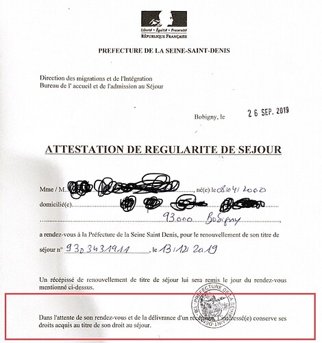 Je ne sais pas par quel moyen mais j’ai réussi à choper un rendez-vous pour la semaine prochaine. Mercredi prochain je devrais déposer mon dossier de déclaration de nationalité. On m’avait fait comprendre qu’il était possible de déposer une demande de nationalité avec un récépissé mais le problème c’est que la préfecture de Bobigny a eu un problème avec les prises de rendez-vous pour le renouvellement de titre de séjour. Pour le dépôt de nationalité il faut formellement avoir un titre en cours de validité et ce n’est pas mon cas. J’ai un titre de séjour provisoire qui n’est plus valable depuis le 25 octobre mais on m’a fourni une attestation de régularité. Le petit passage que j’ai encadré en rouge sur l’attestation de régularité me fait dire que je peux déposer ma demande.