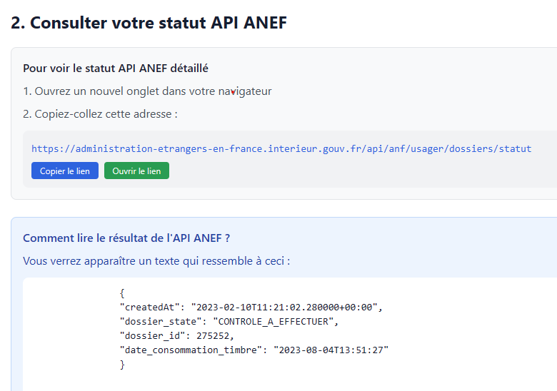 J’ai mis cette capture d’écran pour vous montrer le lien que j’ai utiliser pour consulter mon statut API ANEF
