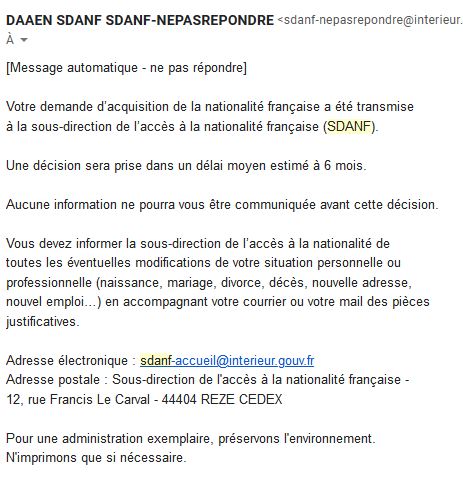 Question : Je viens d’envoyer une mise à jour de mon dossier à SDANF chez qui mon dossier est actuellement (je leur ai envoyé mon nouveau titre de séjour, comme l’ancien arrive bientôt à expiration). J’ai reçu un mail de leur part, vide avec pour objet : ENVOI NOTICE D’INFORMATION(was : ${Objet du mail que j’avais envoyé})
