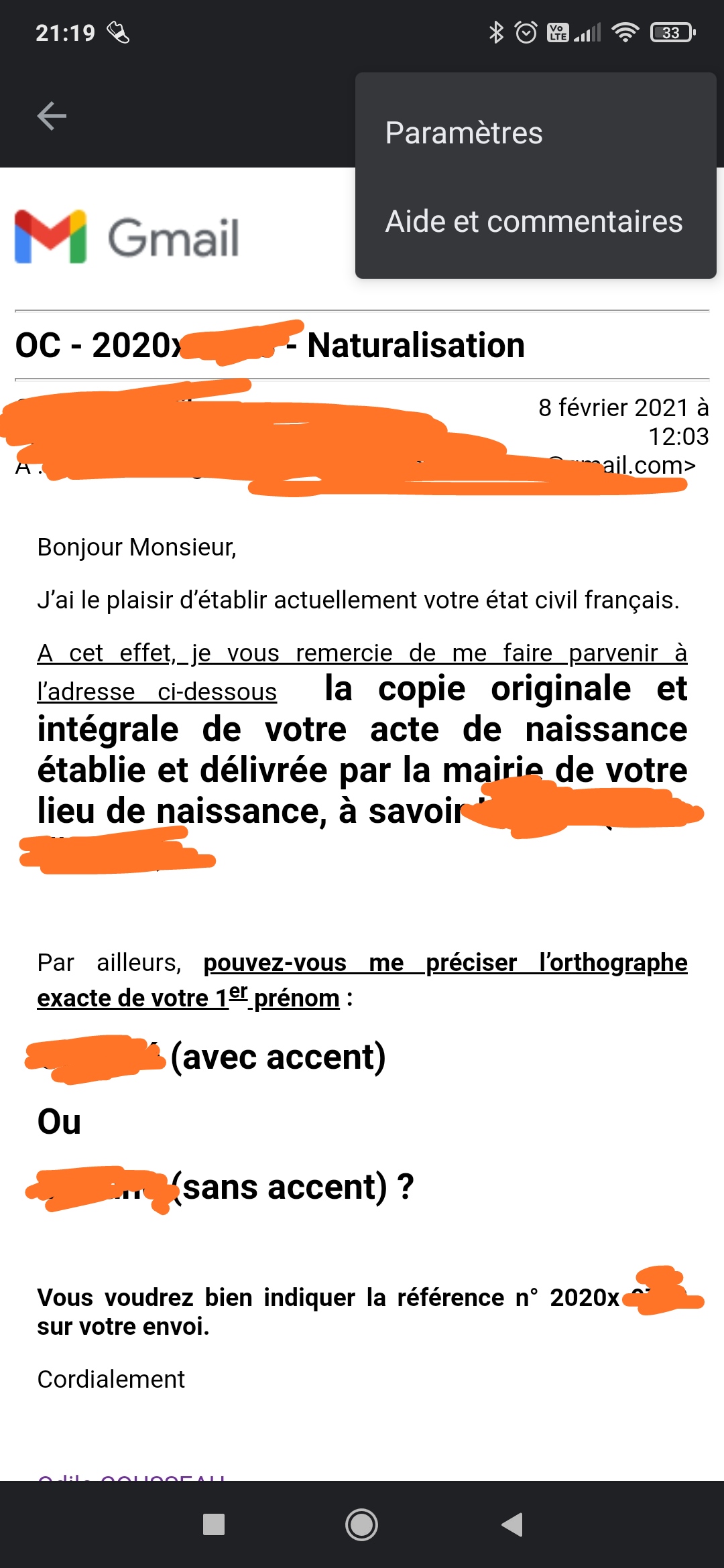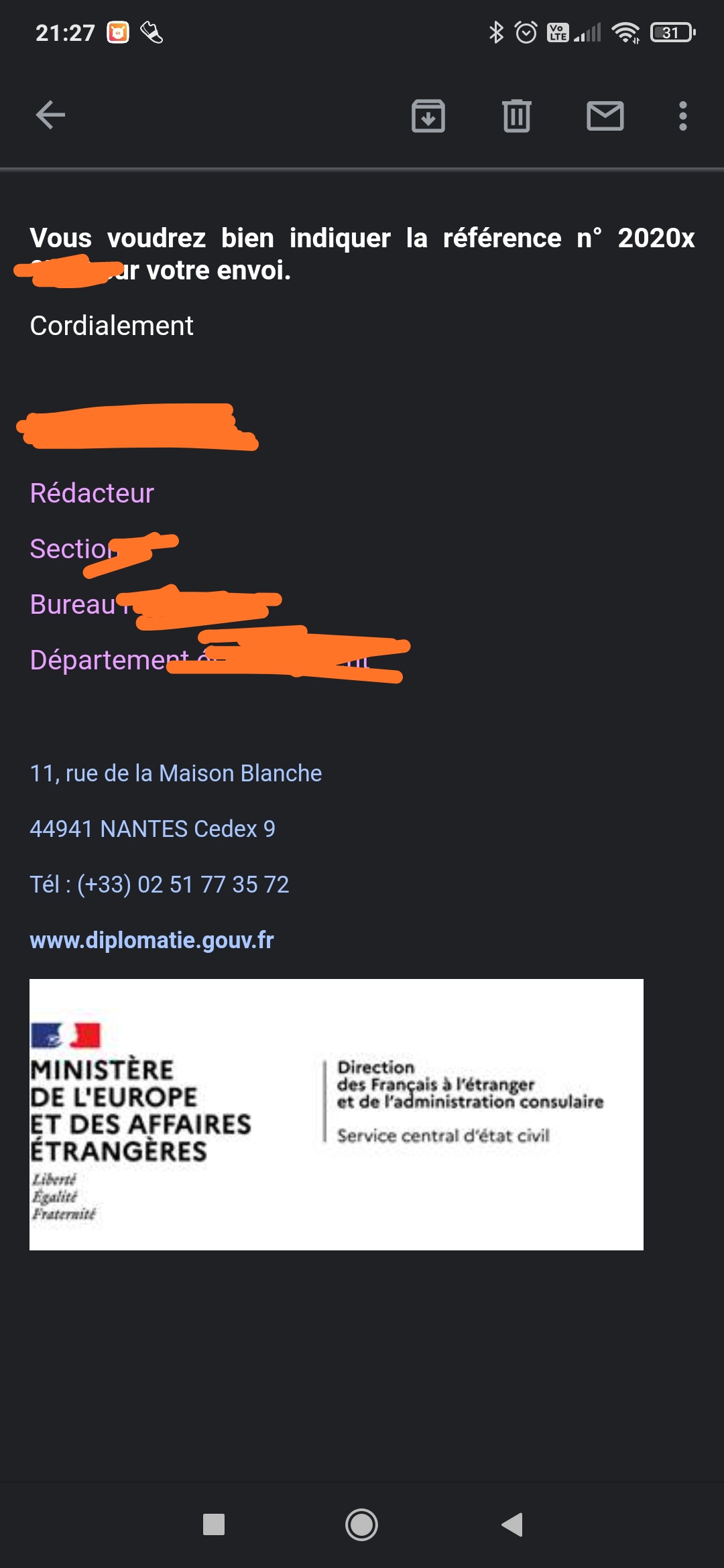 Bonsoir à toutes et à tous. La dame qui s’occupe de mon dossier m’a envoyé un mail pour confirmer l’orthographe de mon premier prénom. Et lui transmettre une copie intégrale de mon acte de naissance. Je viens de lui envoyer un mail avec le scan des documents. Mais demain je vais à la poste pour l’ expédition en « dur » avec accusé de réception. Je pense que c’est ce qu’elle veut. Selon vous dès la réception ça peut aller vite ? Scec team 14 octobre. Merci