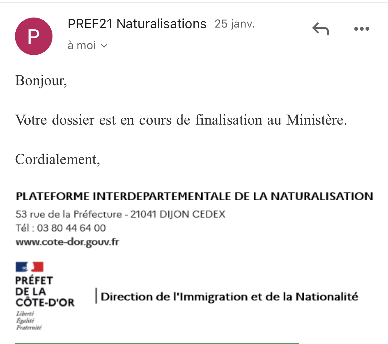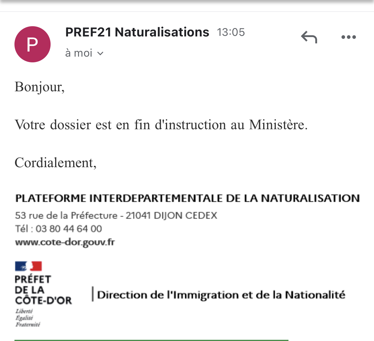 Et hier j’ai reçu une réponse de la SDANF (au mail que j’avais envoyé au SCEC, ils ont dû transférer le mail à SDANF) m’indiquant que mon dossier est en attente de signature auprès de Monsieur Le Ministre pour le décret n°8 et qu’ils n’ont pas le délai pour la signature.