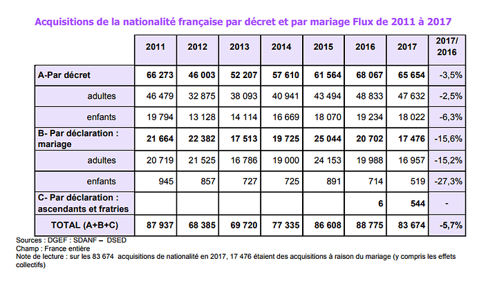 Bonsoir bichette voici les dernières statistiques concernant le nombre global d’acquisitions de la nationalité. En 2017, le flux annuel des acquisitions de la nationalité française par décret et par déclaration (mariages, ascendants et fratries), avec 83 674 nouveaux Français, est en baisse de 5,7%