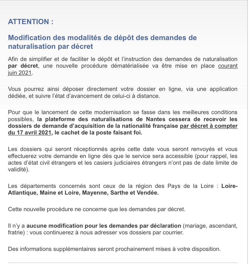Des modifications seront mises en place pour les demandes de naturalisation par décret à partir de mois de juin 2021 à la préfecture de la Loire Atlantique ( le dépôt sera désormais effectué en ligne