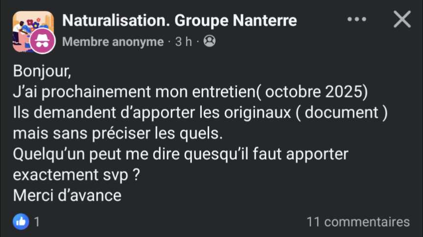 Bonjour à tous, est ce qu’il y a quelqu’un dans ce groupe qui a pu passer l’entretien, ou a reçu des mises à jour ou des controles, ( ceux qui ont déposé les mois 10/11/12 - 2022) ou a été naturalisé ? @Dali216 tu as pu passer l’entretien ? @Ebitdawg, j’espere que des bonnes nouvelles pour toi aprés le controle, est ce que tu as eu des nouvelles ?