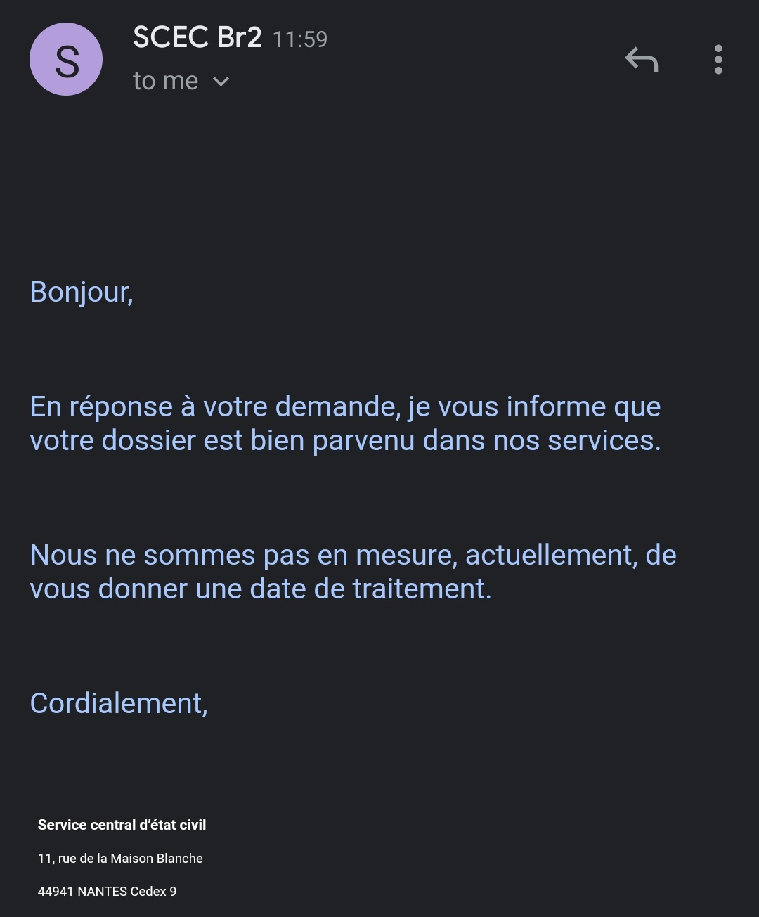 . j’ai préféré ne pas insister, je vais sans doute avoir à relancer le SCEC d’ici 2 semaines … et je sens que je vais encore devoir me battre pour faire avancer mon dossier et pour qu’ils ne m’oublient pas