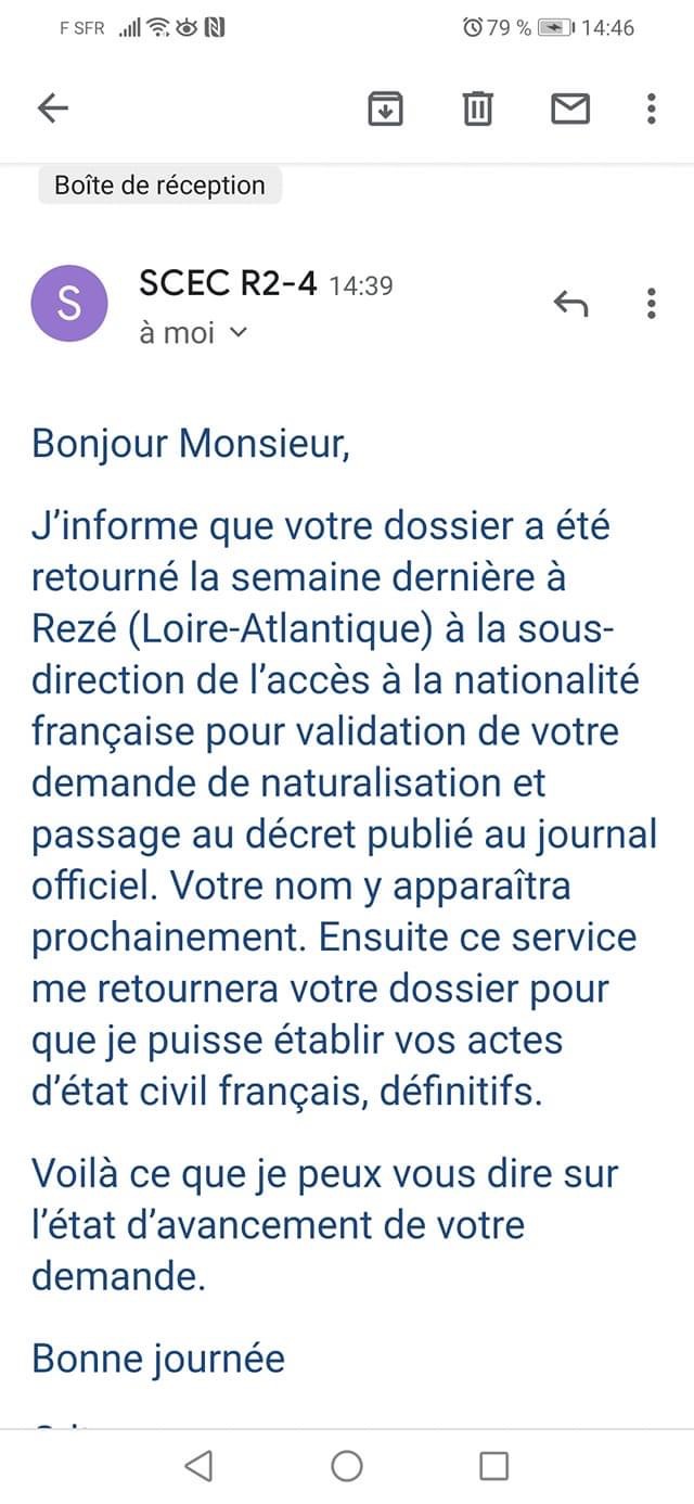 Souvenez vous que le standard téléphonique début Mars meme avant le confinnement ils ne donnaient plus d’infos sur les dossiers de naturalisation ils s’occupaient uniquement des autres demandes (actes naissances, actes mariages, etc…)