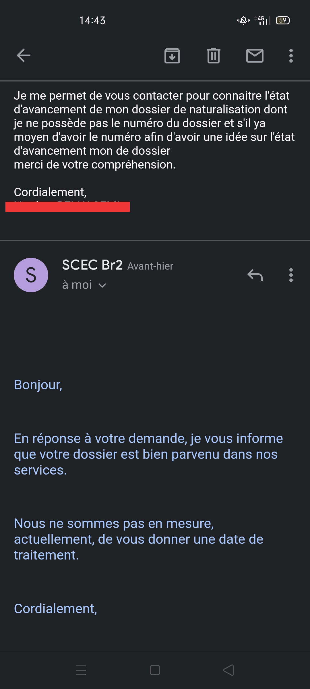 j’espère aussi mais hélas on n’est plus sure de rien ceci dit j’ai remarqué que ceux qui avait leur dossier retourné le 24/07 et naturalisés, étaient arrivés avant moi (22/01) au Scec ceci explique surement ou peut être cela …