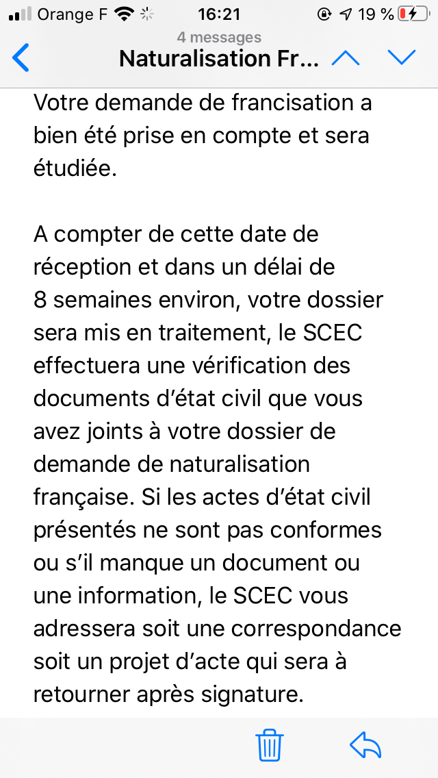 J’avais reçu le même mail, l’agent de la SCEC m’avait dit 8 semaines aussi.