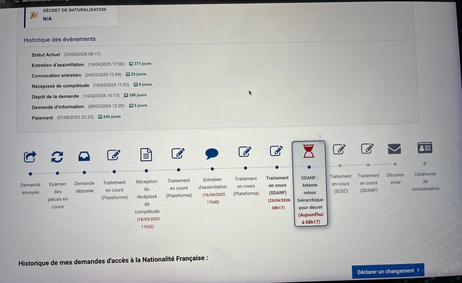 J’ai eu cette mise à jour aujourd’hui à 8h17 (cf photo), quelqu’un a déjà eu cette Maj ou sait ce que ça veut dire? Je n’ai pas vu toutes les autres étapes (SCEC,SDANF2), je me demande si c’est passé rapidement et la validation c’est pour insertion dans décret comme écrit? Ou je ne suis pas allée aux autres étapes et c’est un probable refus.