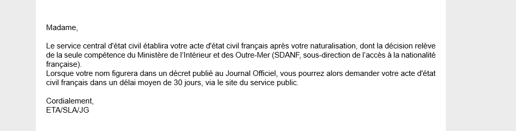 Je vois que de nombreuses personnes qui ont envoyé un e-mail à la deuxième adresse ( sdanf-accueil@interieur.gouv.fr) n’ont reçu qu’un e-mail automatique sans informations réelles. J’ai également envoyé un courriel à sdanf-accueil@interieur.gouv.fr il y a 7 jours, et toujours pas reçu de réponse.