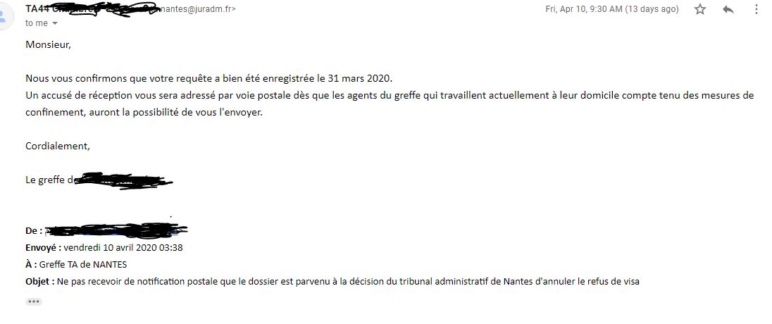 Mon père est un Français de 76 ans résidant en France âgé et malade et son médecin a fait un rapport pour qu’il soit avec lui en France mais LE CONSULAT DE FRANCE (alger) a refusé mon visa et aussi la commission de recours et maintenant j’ai fait appel auprès du tribunal administratif de Nante un requete de visa S’il vous plaît quand répondront-ils à ma demande et y a-t-il une autre solution avec l’expérience s’il vous plaît ai-je besoin de De l’aide?