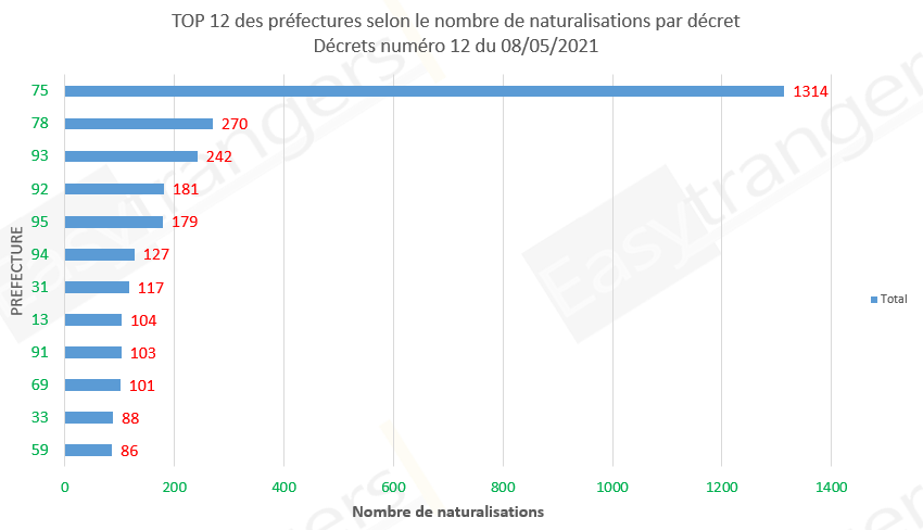 Top 12 des préfectures selon le nombre de naturalisations, décret 12 du 08/05/2021: