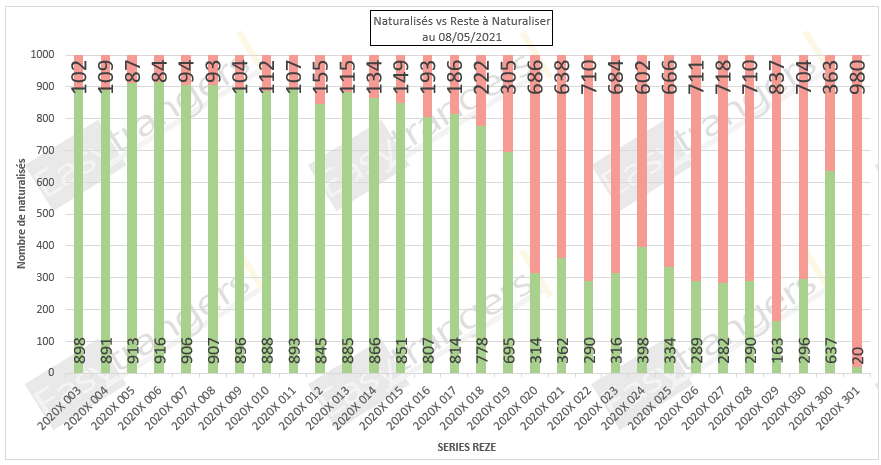 Pour lire le graphique, rien de plus simple, chaque barre correspond à un numéro de série que vous pouvez lire en bas (exemple 2020X003, correspond à la série 03). La partie verte correspond au personnes déjà naturalisées tandis que la partie rouge correspond aux personnes toujours en attente de naturalisation.