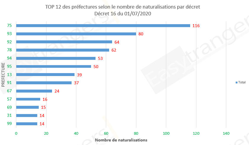 La préfecture de Paris est en tête avec 116 naturalisations suivi par la préfecture de Bobigny (93) et de Nanterre (92) avec 80 et 64 naturalisations respectivement.