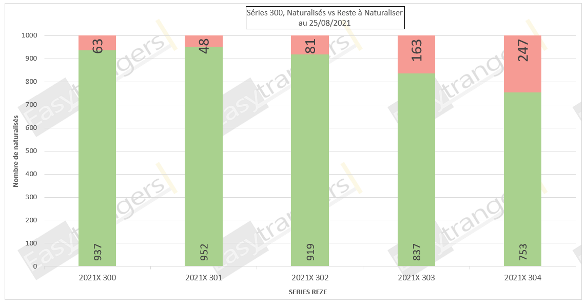 La série la plus naturalisée est la série 304 avec 449 naturalisations (la série 304 concerne les personnes ayant bénéficiées de l’accélération de leur demande de naturalisation suite à leur mobilisation lors de la crise sanitaire)