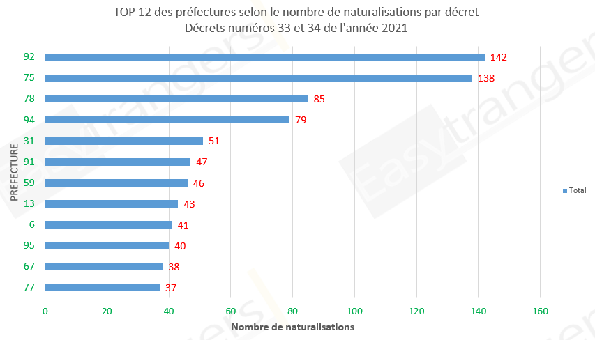 Top 12 des préfectures selon le nombre de naturalisations, décrets 33 et 34 du 29-30/09/2021: