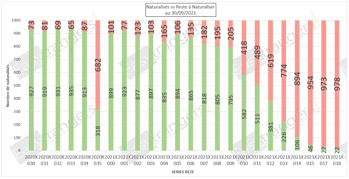 Pour lire le graphique, rien de plus simple, chaque barre correspond à un numéro de série que vous pouvez lire en bas (exemple 2020X030, correspond à la série 30). La partie verte correspond au personnes déjà naturalisées tandis que la partie rouge correspond aux personnes toujours en attente de naturalisation.