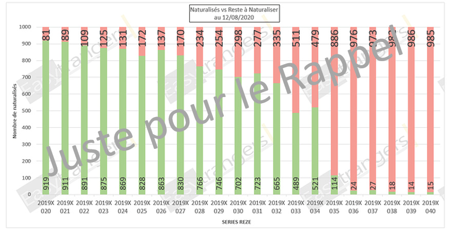 Pour lire le graphique, rien de plus simple, chaque barre correspond à un numéro de série que vous pouvez lire en bas (exemple 2019X029, correspond à la série 29). La partie verte correspond au personnes déjà naturalisées tandis que la partie rouge correspond aux personnes toujours en attente de naturalisation. Voici ce que devient le statut des naturalisations après ce dernier décret: