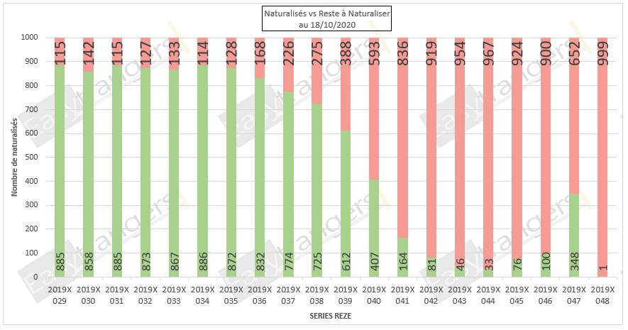 Pour lire le graphique, rien de plus simple, chaque barre correspond à un numéro de série que vous pouvez lire en bas (exemple 2019X029, correspond à la série 29). La partie verte correspond au personnes déjà naturalisées tandis que la partie rouge correspond aux personnes toujours en attente de naturalisation.