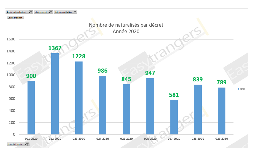 Le nombre de naturalisations dans les 3 derniers décret est en dessous de la moyenne avec à peine 581 personnes naturalisée dans le décret 27 (c’est à peine un demi décret par rapport à la moyenne lissée sur l’année).